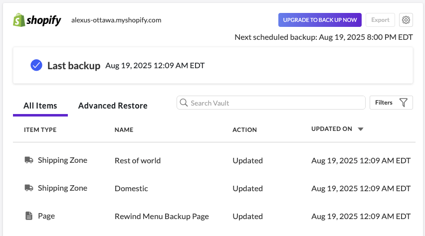 Your Shopify store data is automatically and securely backed up every day, with 365 day retention and full version history for your online store, items, collections, orders, and more.