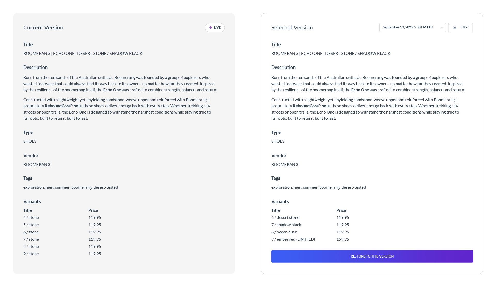 When a data import fails or a design change goes sideways, it can impact your whole store. With Rewind, you can undo the damage with the flexibility to recover individual records or roll back your store to a previous state.