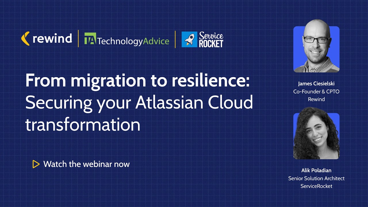 In From Migration to Resilience: Securing Your Atlassian Cloud Transformation, experts from Rewind and ServiceRocket will share insights on how to build data resilience into your migration plan from the outset.